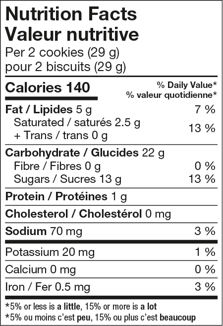 Cookie (enriched wheat flour, sugar, palm oil, salt, sodium bicarbonate, soya lecithin, artificial flavour, milk ingredients), Creme (sugar, palm oil, soya lecithin, artificial flavour, caramel). Contains: Milk, Soya, Wheat.