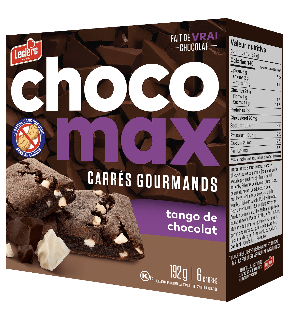 Sugars (sugar, fructose, glucose, apple puree [apple, ascorbic acid, pectinase]), Enriched wheat flour, White chocolate chips (sugar, cocoa butter, modified milk ingredients, soya lecithin, vanilla extract), Canola oil, Cocoa powder, Liquid whole egg, Butter (milk), Glycerin, Modified corn starch, Liquid yolk mix (eggs), Baking powder, Natural flavour, Gum blend (xanthan gum, locust bean gum, guar gum), Salt, Soya lecithin, Sodium bicarbonate.
