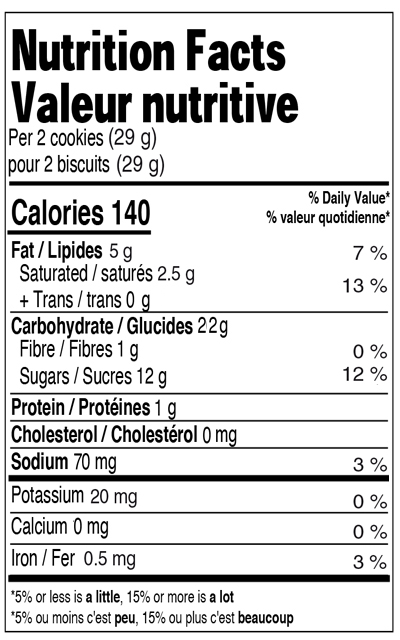 Cookie (enriched wheat flour, sugar, palm oil, maple syrup, salt, sodium bicarbonate, soya lecithin, modified milk ingredients), Creme (sugar, palm oil, soya lecithin, natural and artificial flavour, caramel). Contains: Milk, Soya, Wheat.