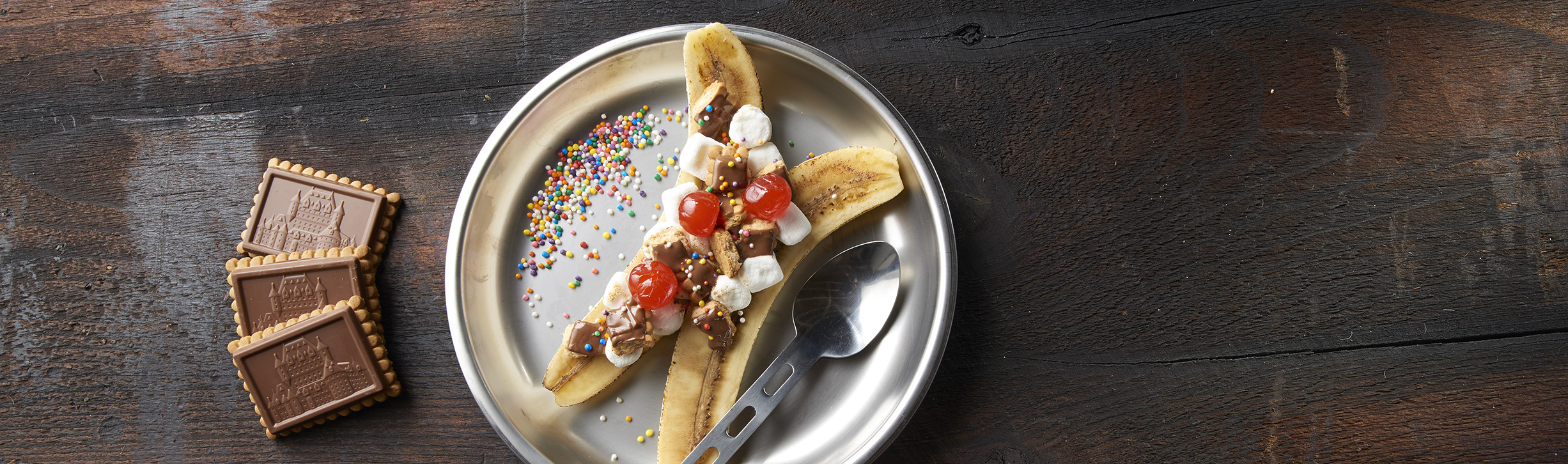 3. Sprinkle bananas with chopped butter cookies and mini marshmallows. Fold up vertical sides of foil so ends meet, then roll downwards to seal top. Fold in sides of foil to seal packets well.
