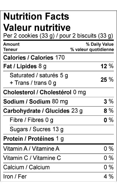 SUCRE, FARINE DE BLÉ ENRICHIE, HUILE MODIFIÉE DE PALME ET/OU DE PALMISTE, CASSONADE, AMIDON DE BLÉ, FLOCONS D'AVOINE ENTIÈRE, BICARBONATE DE SODIUM, SEL, LÉCITHINE DE SOYA, SUBSTANCES LAITIÈRES, GRAINES DE GOUSSE DE VANILLE, ARÔME NATUREL. PEUT CONTENIR DES OEUFS. *Absence d’arachides. www.allergene-controle.com