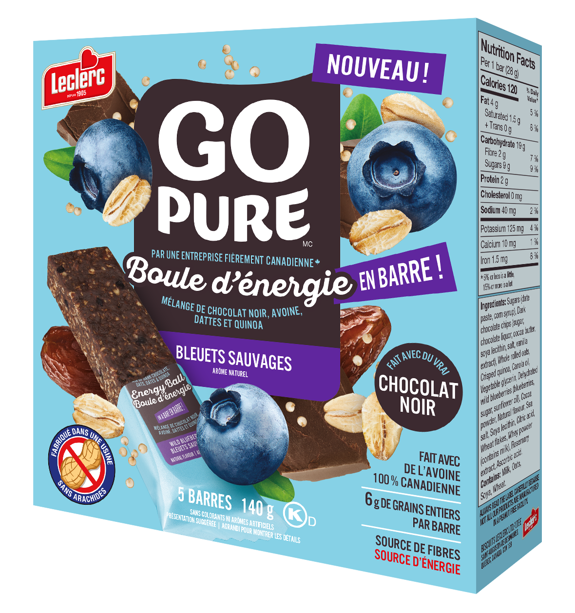 Sucres (pâte de dattes, sirop de maïs), Brisures de chocolat noir (sucre, liqueur de chocolat, beurre de cacao, lécithine de soya, sel, extrait de vanille), Flocons d'avoine entière, Quinoa croustillant, Huile de canola, Glycérine végétale, Bleuets sauvages déshydratés (bleuets, sucre, huile de tournesol), Poudre de cacao, Arôme naturel, Sel de mer, Lécithine de soya, Acide citrique, Flocons de blé, Poudre de lactosérum (contient du lait), Extrait de romarin, Acide ascorbique.