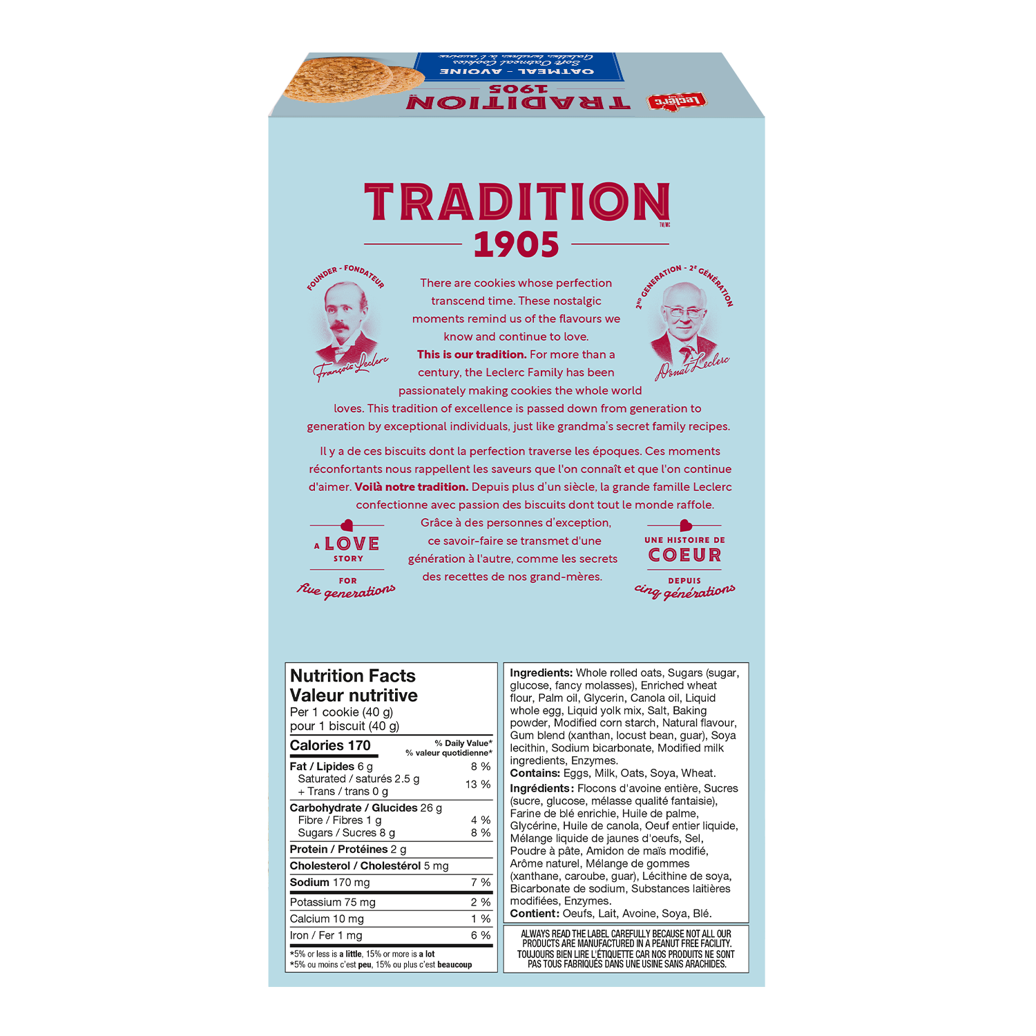 Flocons d'avoine entière • Sucres (sucre, glucose, mélasse qualité fantaisie) • Farine de blé enrichie • Huile de palme • Glycérine • Huile de canola • Oeuf entier liquide • Mélange liquide de jaunes d'œufs • Sel • Poudre à pâte • Amidon de maïs modifié • Arôme naturel • Mélange de gommes (xanthane, caroube, guar) • Lécithine de soya • Bicarbonate de sodium • Substances laitières modifiées • Enzymes