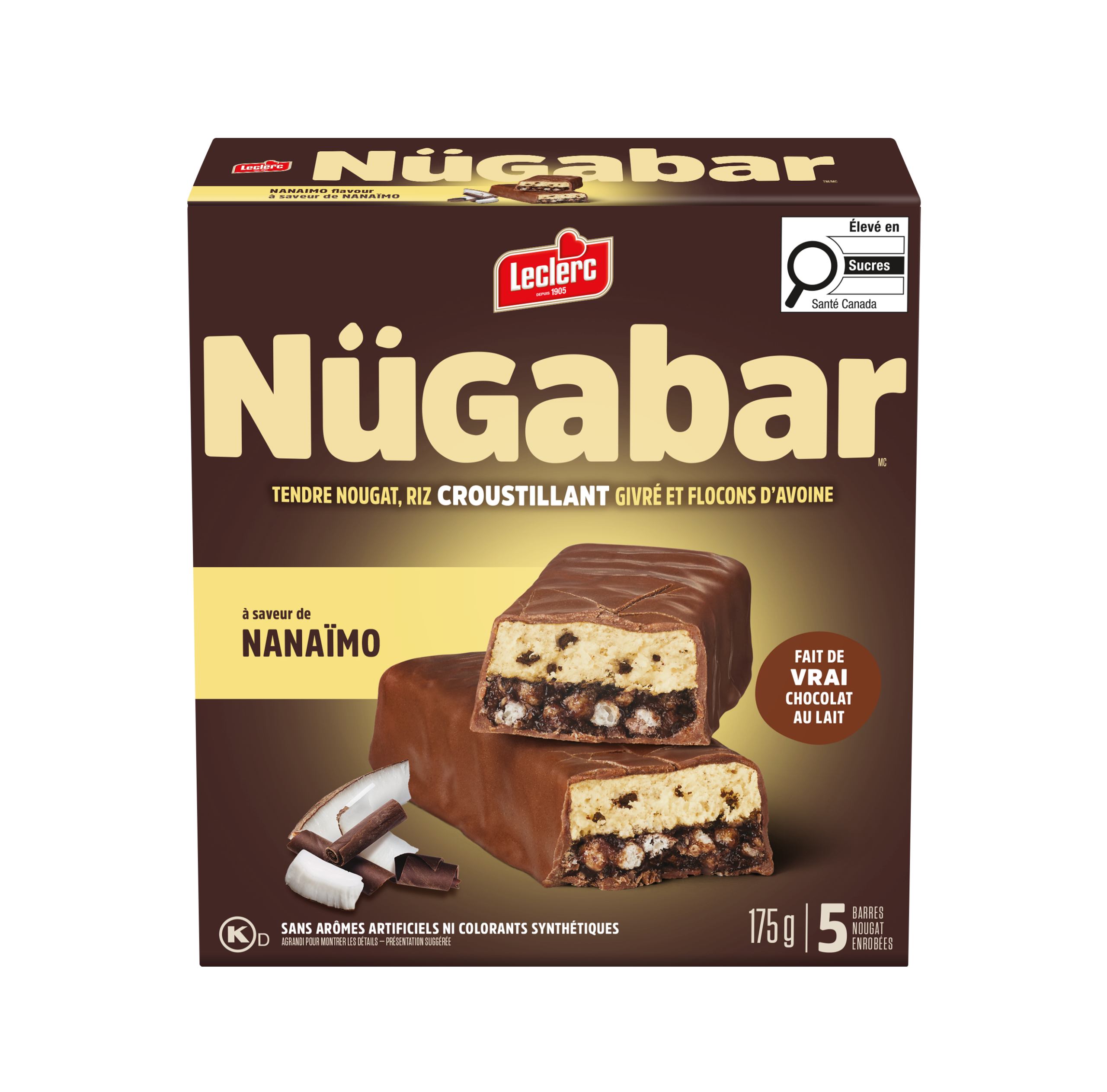 Sucres (glucose, sucre, sucre à glacer, fructose, miel, extrait sec de malt [orge]), Chocolat au lait (sucre, beurre de cacao, liqueur de chocolat, substances laitières, lécithine de soya, extrait de vanille), Riz croustillant givré (farine de riz, sucre, huile de canola, carbonate de calcium, sel, mélasse qualité fantaisie, bicarbonate de sodium, lécithine de soya), Huile de canola, Flocons d'avoine entière, Morceaux de biscuits au chocolat (farine de blé enrichie, sucre, poudre de cacao, huile de palme, glucose, bicarbonate de sodium, sel, arôme naturel, substances laitières), Substances laitières modifiées, Glycérine, Poudre de cacao, Amidon de blé, Sel, Arôme naturel, Lécithine de soya, Beurre d'amande, Beurre d'arachide, Beurre de noix de cajou, Extrait de romarin, Acide ascorbique, Carotène, Huile de tournesol.