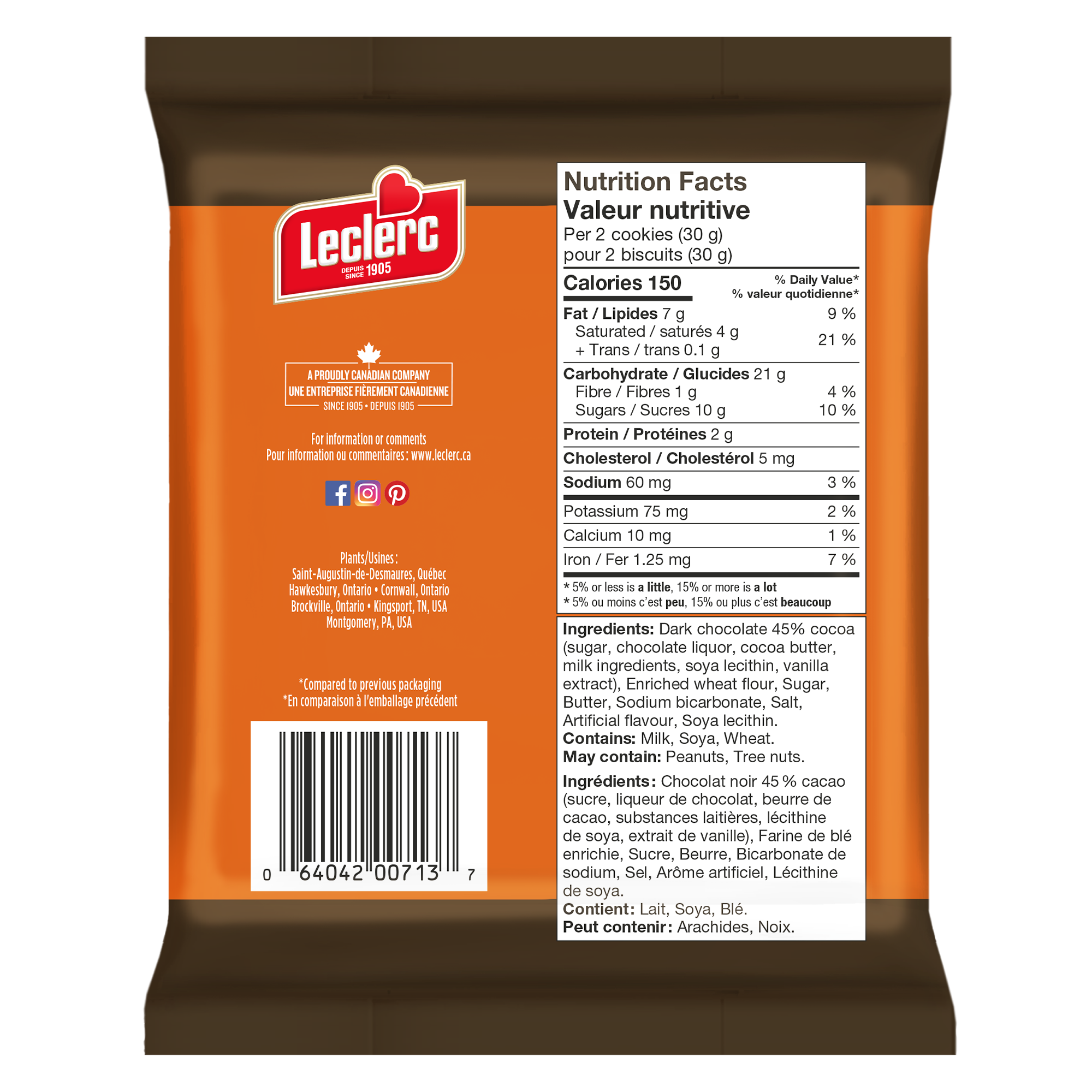 Dark chocolate 45% cocoa (sugar, chocolate liquor, cocoa butter,milk ingredients, soya lecithin, vanilla extract), Enriched wheat flour, Sugar, Butter, Sodium bicarbonate, Salt, Artificial flavour, Soya lecithin. Contains: Milk, Soya, Wheat.