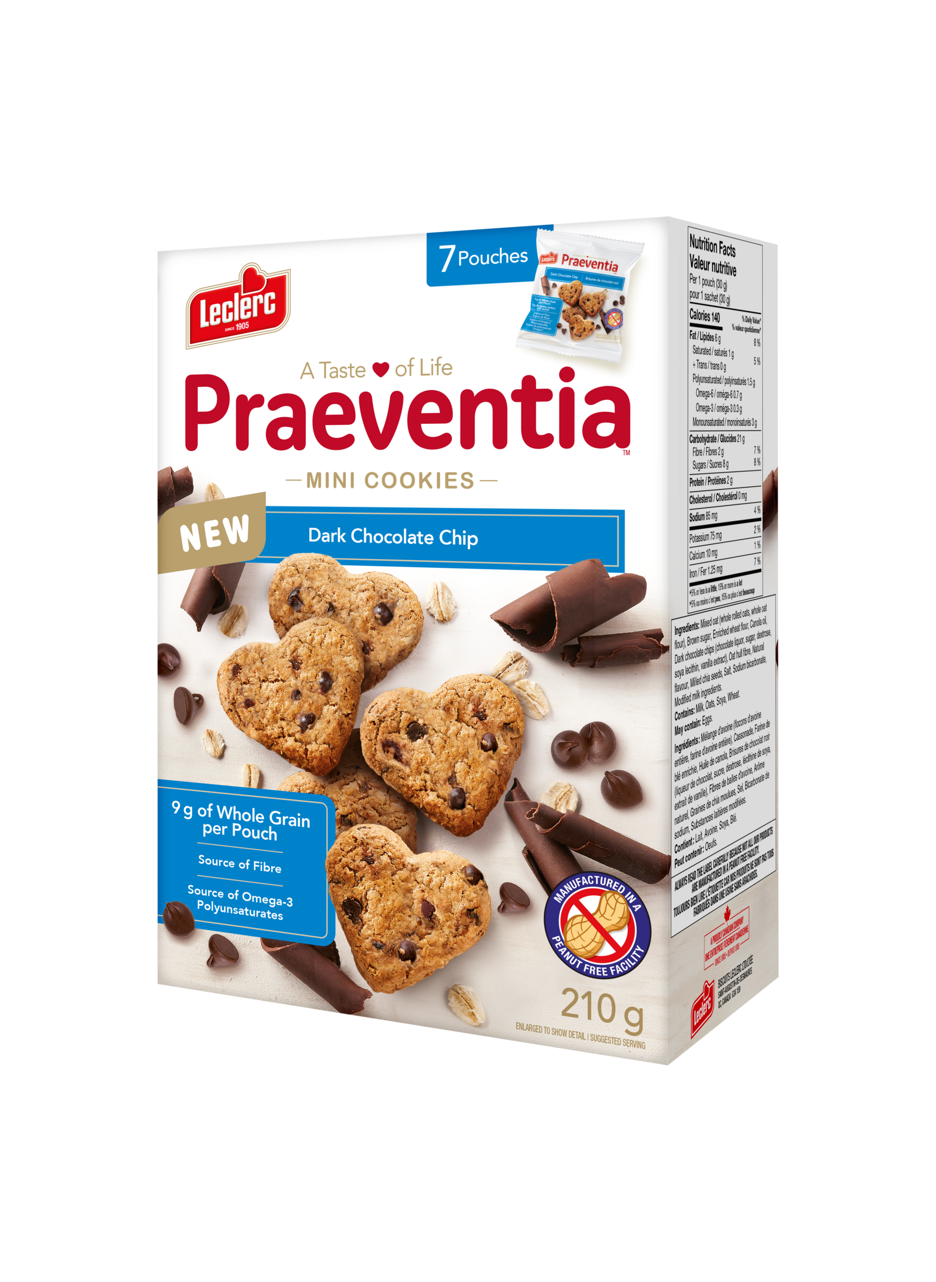 Mixed oat (whole rolled oats, whole oat flour), Brown sugar, Enriched wheat flour, Canola oil, Dark chocolate chips 70% cocoa (chocolate liquor, sugar, dextrose, cocoa powder, cocoa butter, soya lecithin, vanilla extract), Chicory root inulin, Cocoa powder, Salt, Natural flavour, Sodium bicarbonate, Modified milk ingredients. Contains: Milk, Oats, Soya, Wheat.