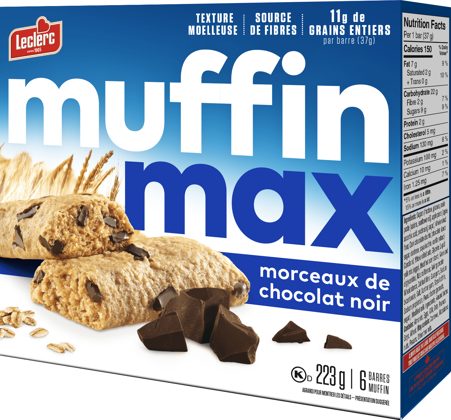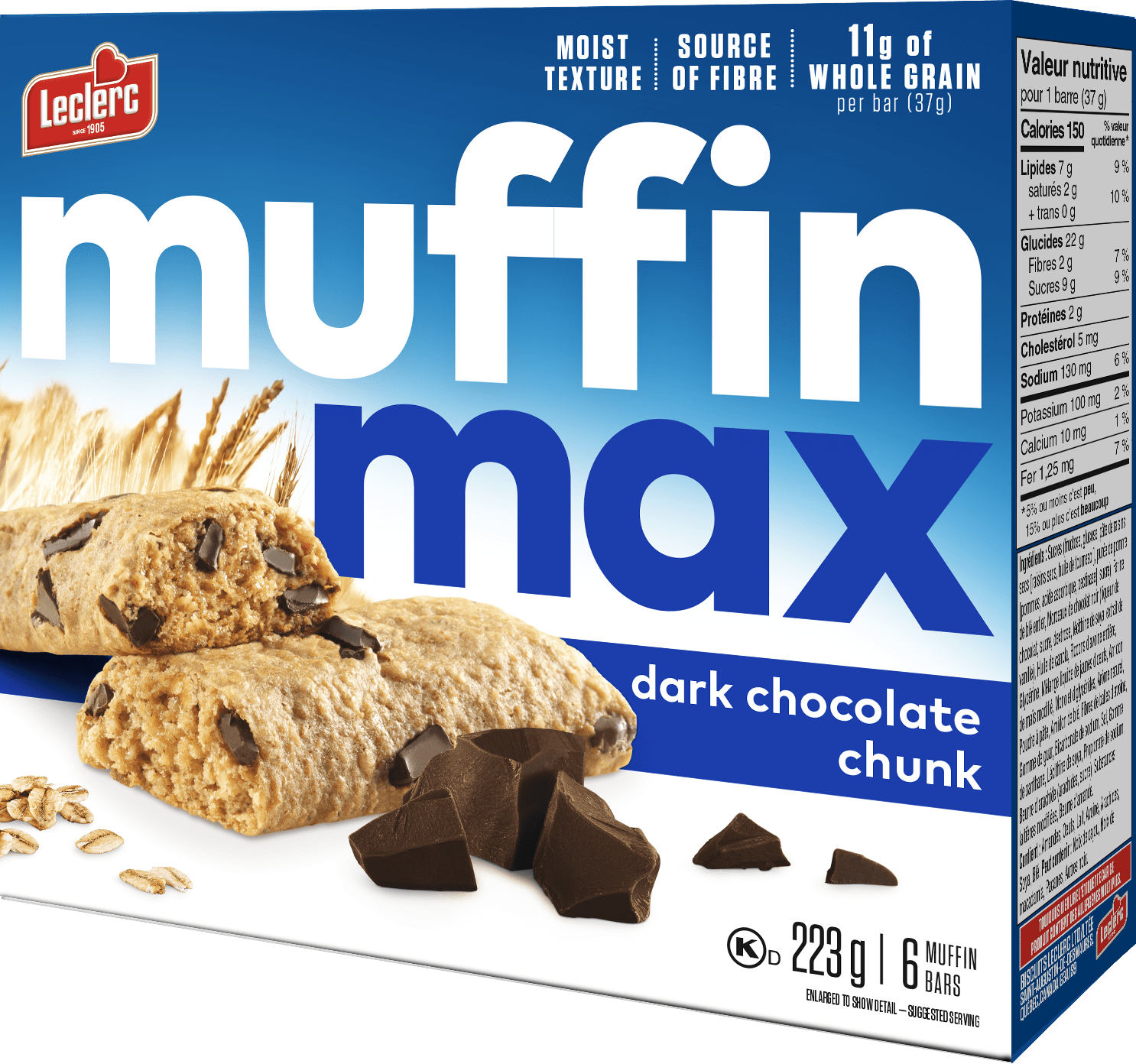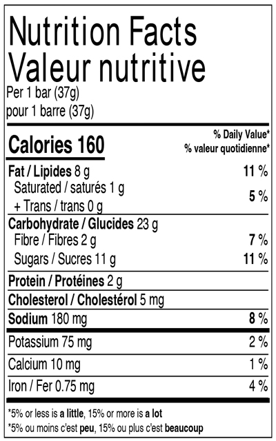 Sugars (fructose, glucose, raisin paste [raisins, sunflower oil], apple puree [apple, ascorbic acid, pectinase], sugar), Whole wheat flour, Dark chocolate chunks (chocolate liquor, sugar, dextrose, soya lecithin, vanilla extract), Canola oil, Whole rolled oats, Glycerin, Liquid yolk mix (eggs), Modified corn starch, Mono and diglycerides, Natural flavour, Baking powder, Wheat starch, Oat hull fibre, Guar gum, Sodium bicarbonate, Salt, Xanthan gum, Soya lecithin, Sodium propionate, Peanut butter (peanuts, sugar), Modified milk ingredients, Almond butter.