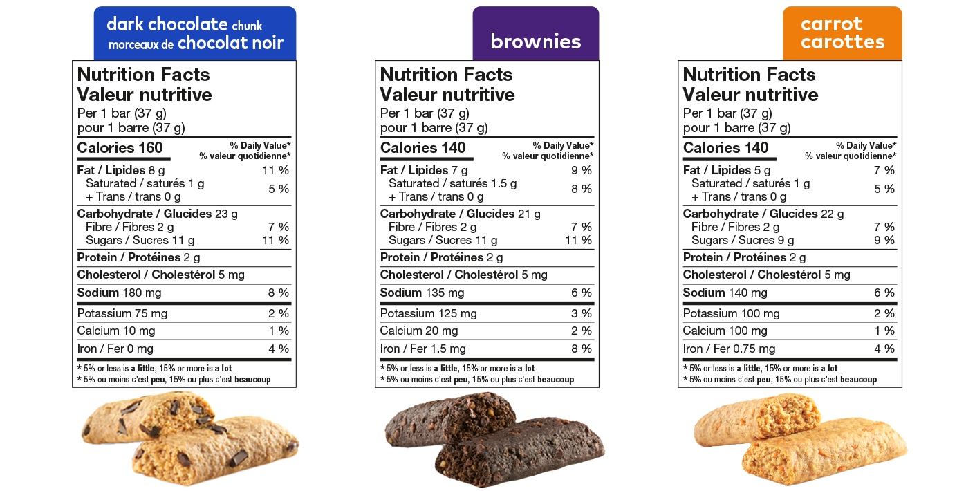Sugars (fructose, raisin paste [raisins, sunflower oil], glucose, apple puree [apple, ascorbic acid, pectinase], sugar), Whole wheat flour, Whole rolled oats, Carrots, Canola oil, Glycerin, Liquid yolk mix (eggs), Wheat starch, Mono and diglycerides, Modified corn starch, Oat hull fibre, Natural flavour, Baking powder, Guar gum, Salt, Sodium bicarbonate, Xanthan gum, Spices, Sodium propionate, Soya lecithin, Peanut butter (peanuts, sugar), Modified milk ingredients, Almond butter.