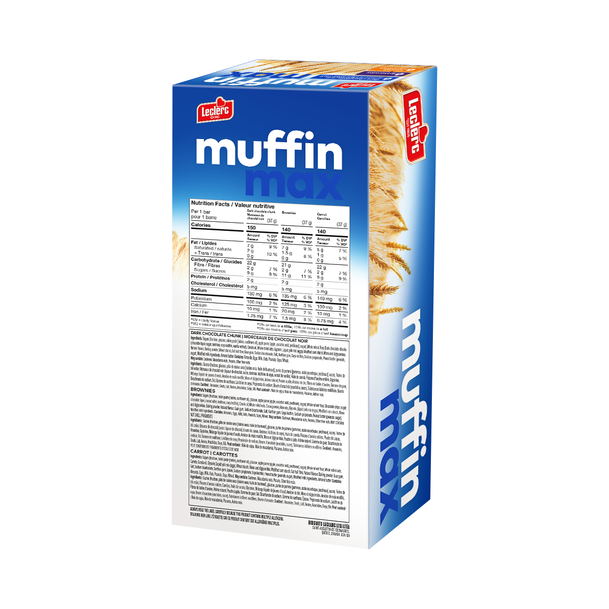Sugars (fructose, raisin paste [raisins, sunflower oil], glucose, apple puree [apple, ascorbic acid, pectinase], sugar), Whole wheat flour, Chocolate chips (sugar, chocolate liquor, cocoa butter, dextrose, soya lecithin), Canola oil, Whole rolled oats, Cocoa powder, Almonds, Glycerin, Liquid yolk mix (eggs), Modified corn starch, Mono and diglycerides, Baking powder, Natural flavour, Guar gum, Sodium bicarbonate, Salt, Xanthan gum, Soya lecithin, Sodium propionate, Peanut butter (peanuts, sugar), Modified milk ingredients.