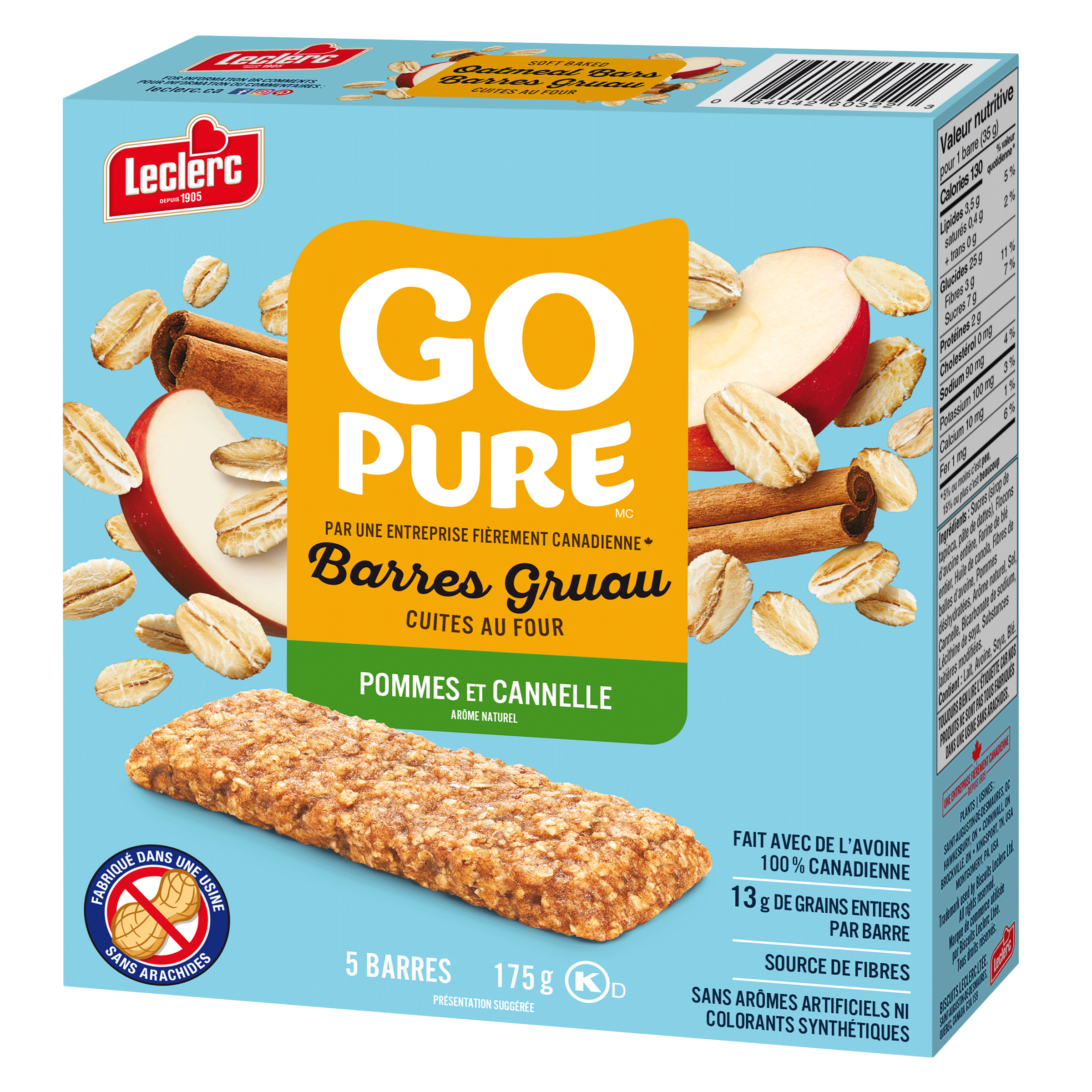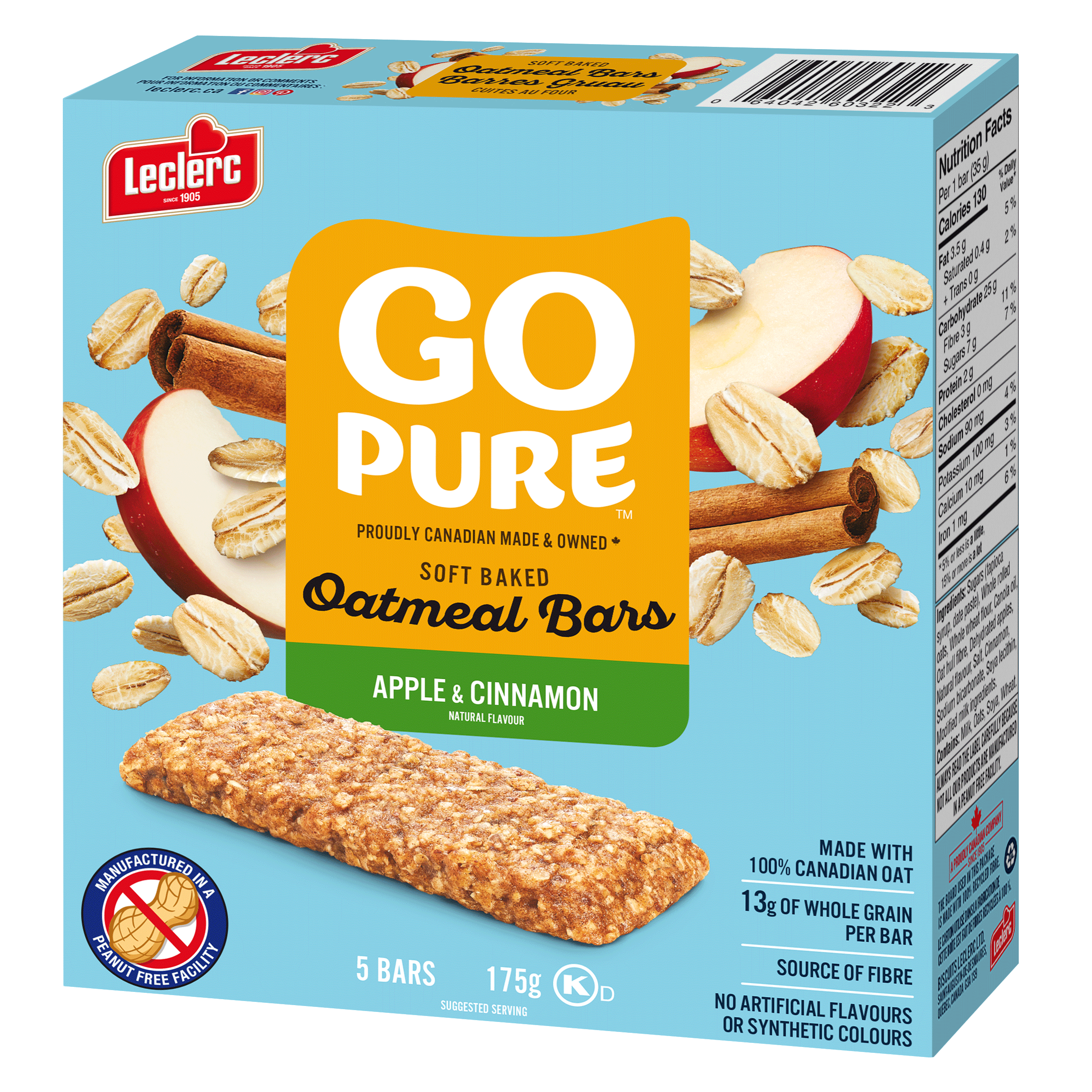 Sugars (tapioca syrup, date paste), Whole rolled oats, Whole wheat flour, Canola oil, Oat hull fibre, Dehydrated apples, Natural flavour, Salt, Cinnamon, Sodium bicarbonate, Soya lecithin, Modified milk ingredients. Contains: Milk, Oats, Soya, Wheat.