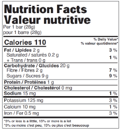 Sucres (pommes déshydratées, sirop de maïs, pâte de dattes, fructose, miel), Flocons d'avoine entière, Huile de canola, Glycérine végétale, Poudre de betteraves (betteraves, poudre de balles de riz), Framboises déshydratées, Arôme naturel, Lécithine de soya, Sel, Rouge de betterave, Substances laitières modifiées, Flocons de blé.