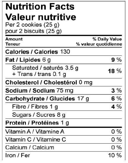 FARINE DE BLÉ ENRICHIE, SUCRE, HUILE DE PALME MODIFIÉE ET HUILE DE PALMISTE MODIFIÉE, HUILE DE PALME, POUDRE DE CACAO, LIQUEUR DE CHOCOLAT, GLUCOSE, SEL, AMIDON DE BLÉ, LÉCITHINE DE SOYA, BICARBONATE DE SODIUM, SUBSTANCES LAITIÈRES, ARÔME NATUREL ET ARTIFICIEL. CONTIENT DU BLÉ, DU SOYA ET DU LAIT. PEUT CONTENIR DES OEUFS.