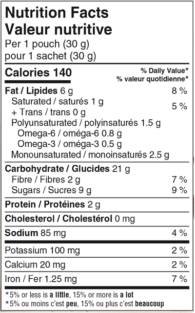Mélange d'avoine (flocons d'avoine entière, farine d'avoine entière), Cassonade, Farine de blé enrichie, Huile de canola, Brisures de chocolat noir 70% cacao (liqueur de chocolat, sucre, dextrose, poudre de cacao, beurre de cacao, lécithine de soya, extrait de vanille), Canneberges déshydratées (sucre, canneberges, huile de tournesol), Poudre de cacao, Graines de chia moulues, Arôme naturel, Bicarbonate de sodium, Sel, Substances laitières modifiées.