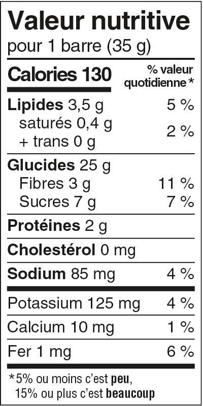 Sucres (sirop de tapioca, pâte de dattes), Flocons d'avoine entière, Huile de canola, Farine de blé entier, Fibres de balles d'avoine, Carottes déshydratées, Sel, Arôme naturel, Épices, Bicarbonate de sodium, Substances laitières modifiées, Lécithine de soya.