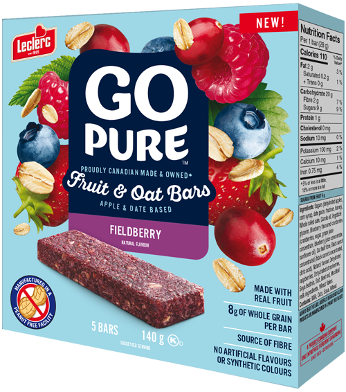 Sucres (pommes déshydratées, sirop de maïs, pâte de dattes, fructose, miel), Flocons d'avoine entière, Huile de canola, Glycérine végétale, Canneberges à saveur de bleuets (canneberges, sucre, concentré de jus de raisin, concentré de jus de bleuet, huile de tournesol), Fibres de balles d'avoine, Concentré de carotte noire (concentré de carotte noire, acide citrique), Arôme naturel, Framboises déshydratées, Fraises déshydratées, Lécithine de soya, Sel, Rouge de betterave, Substances laitières modifiées, Flocons de blé.