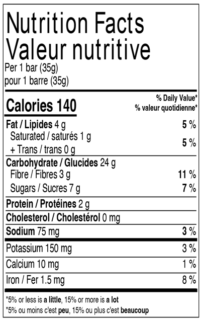 Sucres (sirop de tapioca, pâte de dattes), Flocons d'avoine entière, Farine de blé entier, Huile de canola, Brisures de chocolat (sucre, liqueur de chocolat, beurre de cacao, dextrose, lécithine de soya), Poudre de cacao, Arôme naturel, Fibres de balles d'avoine, Sel, Bicarbonate de sodium, Substances laitières modifiées.