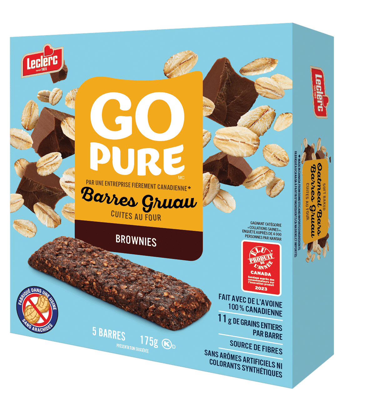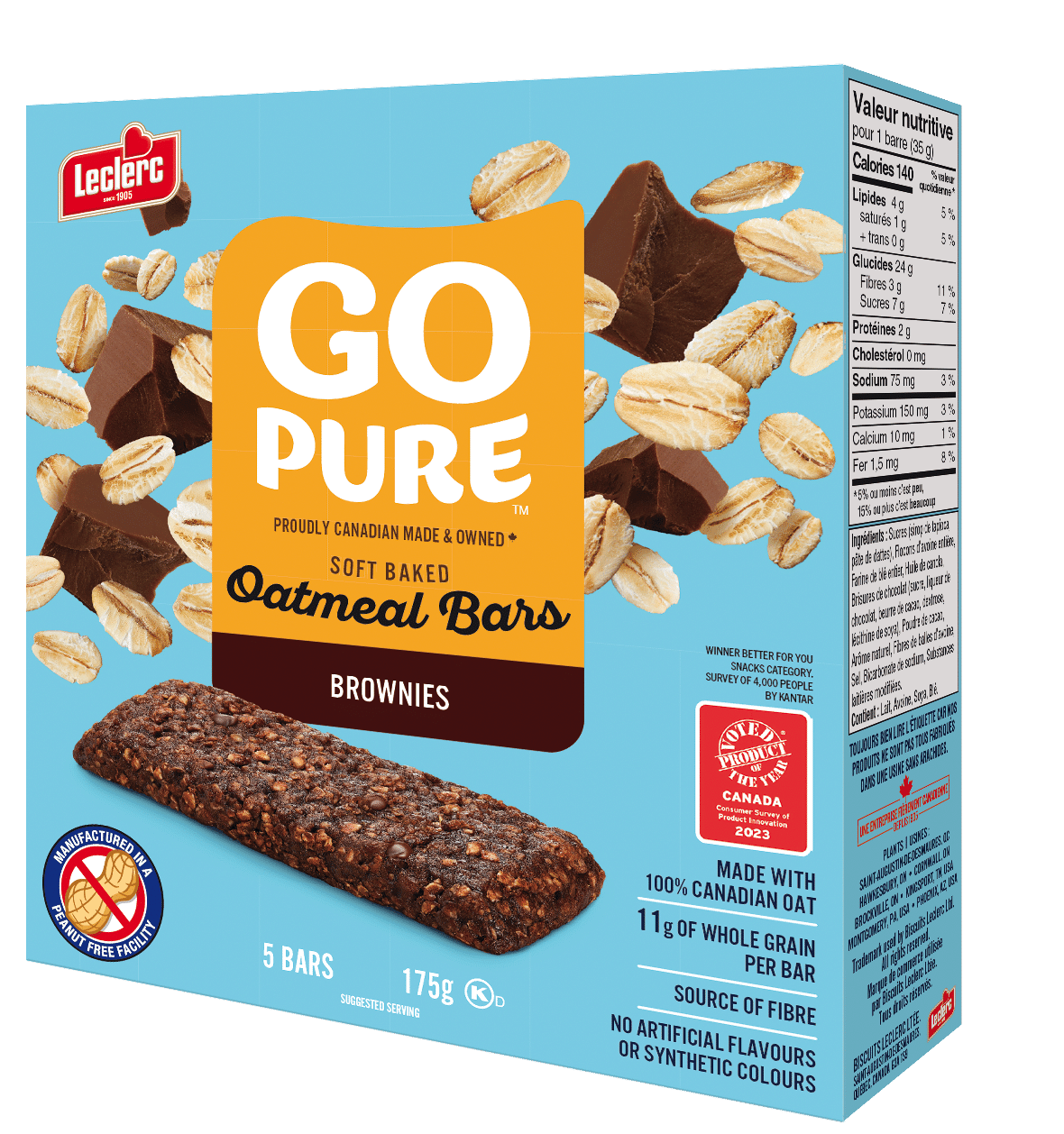 La barre Go Pure gruau brownies a gagné le prix Product of the Year 2023 dans la catégorie « Collations Saines ». Enquête de 4 000 personnes par Kantar. Retrouvez le goût réconfortant du gruau dans les nouvelles barres brownies Go Pure cuites au four ! Elles sont certifiées sans arachides, faites d'avoine 100 % canadienne et contiennent 11 g de grains entiers.