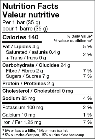 Sucres (sirop de tapioca, pâte de dattes, bananes déshydratées), Flocons d'avoine entière, Farine de blé entier, Brisures de chocolat (sucre, liqueur de chocolat, beurre de cacao, dextrose, lécithine de soya), Huile de canola, Arôme naturel, Sel, Bicarbonate de sodium, Substances laitières modifiées. Contient : Lait, Avoine, Soya, Blé.