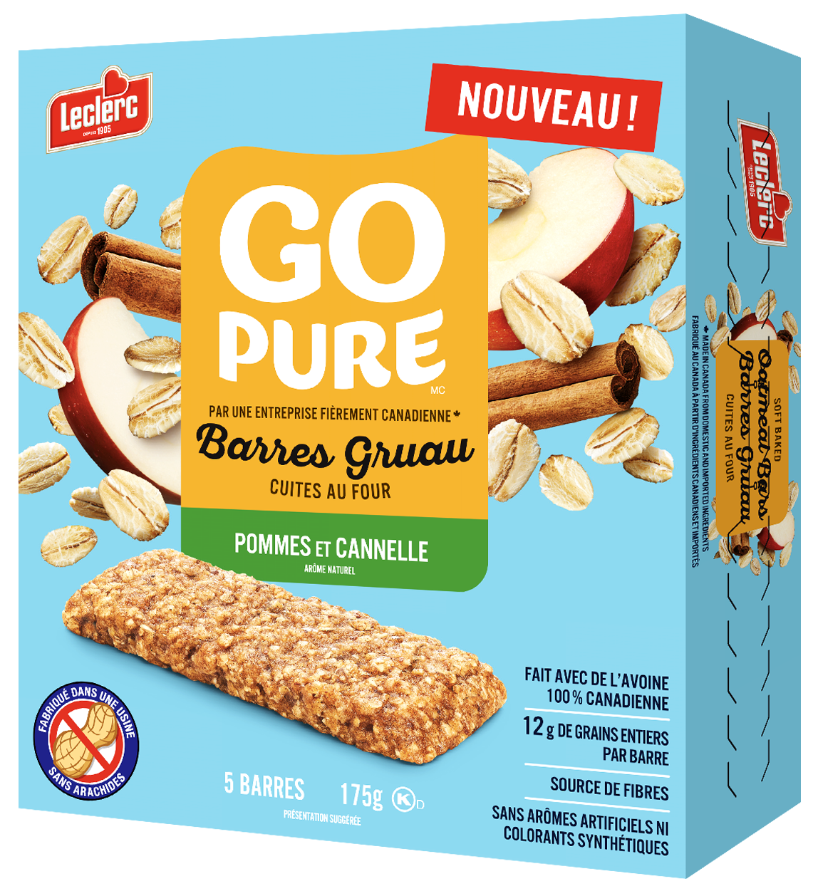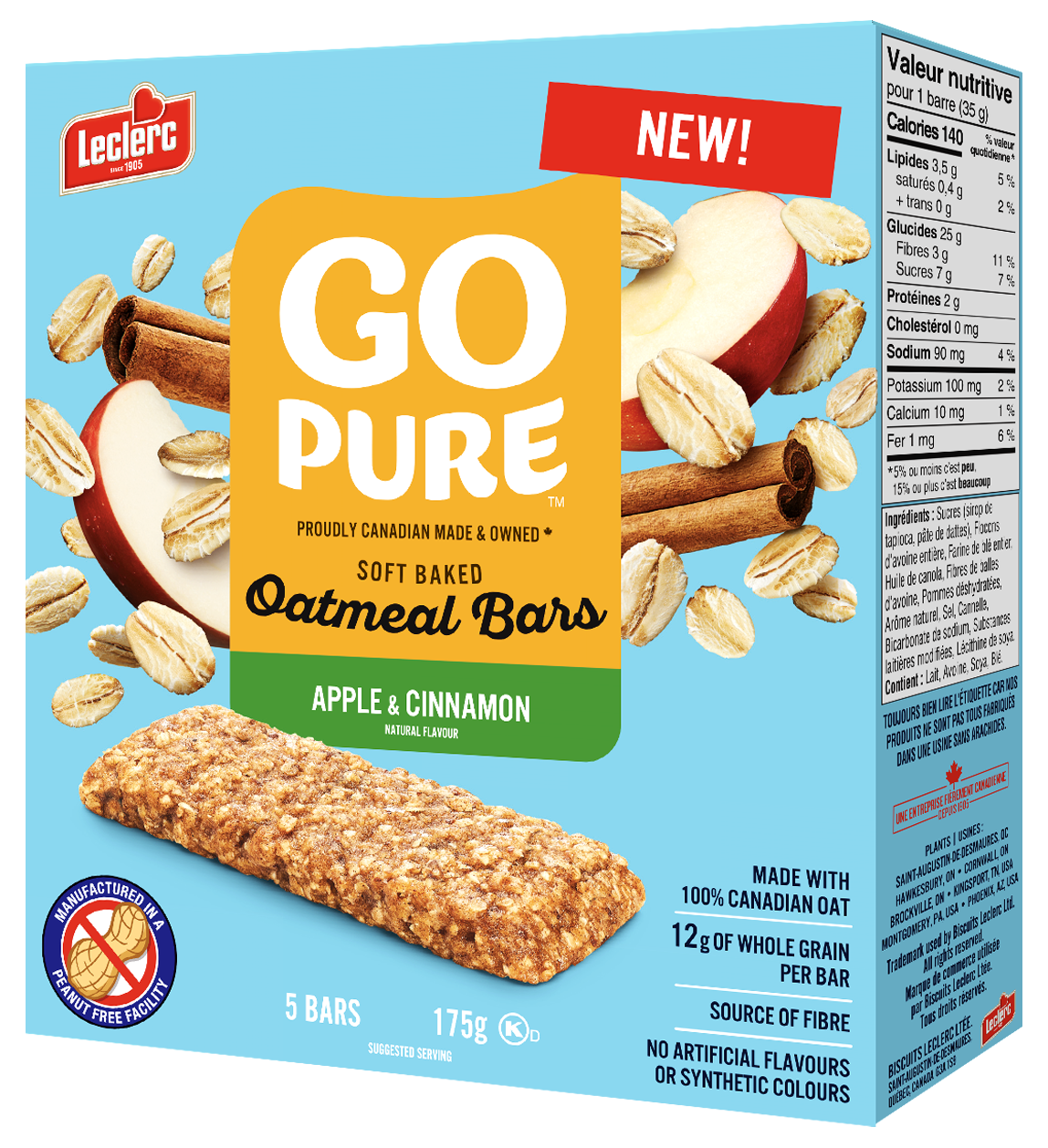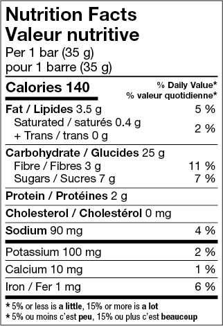 Sucres (sirop de tapioca, pâte de dattes), Flocons d'avoine entière, Farine de blé entier, Huile de canola, Fibres de balles d'avoine, Pommes déshydratées, Arôme naturel, Sel, Cannelle, Bicarbonate de sodium, Substances laitières modifiées, Lécithine de soya. Contient: Lait, Avoine, Soya, Blé.