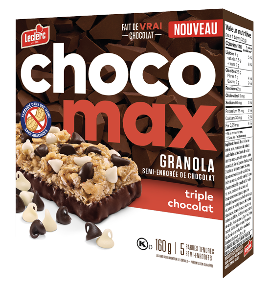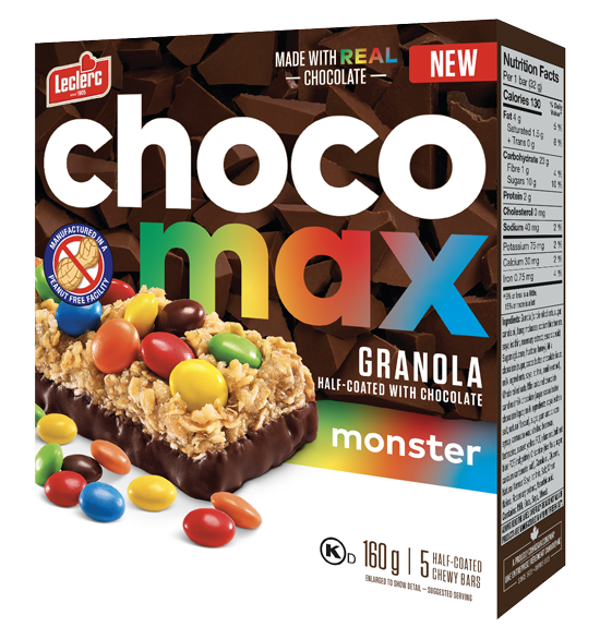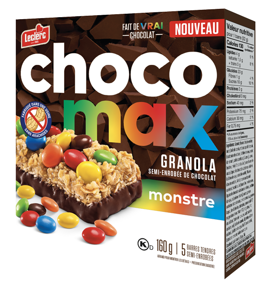 Granola (flocons d'avoine entière, sucre, huile de canola, mélasse qualité fantaisie, bicarbonate de sodium, lécithine de soya, extrait de romarin, acide ascorbique), Sucres (glucose, fructose, miel), Chocolat au lait (sucre, beurre de cacao, liqueur de chocolat, substances laitières, lécithine de soya, extrait de vanille), Flocons d'avoine entière, Mini bonbons au chocolat colorés (chocolat au lait [sucre, beurre de cacao, liqueur de chocolat, substances laitières, lécithine de soya, sel, arôme naturel], sucre, gomme arabique, sirop de maïs, cire de carnauba, gomme laque, cire d'abeilles, tartrazine, jaune soleil FCF, rouge allura, bleu brillant FCF, indigotine), Riz croustillant (farine de riz, sucre, carbonate de calcium, sel), Huile de canola, Glycérine, Arôme naturel, Lécithine de soya, Sel, Flocons de blé, Extrait de romarin, Acide ascorbique.
