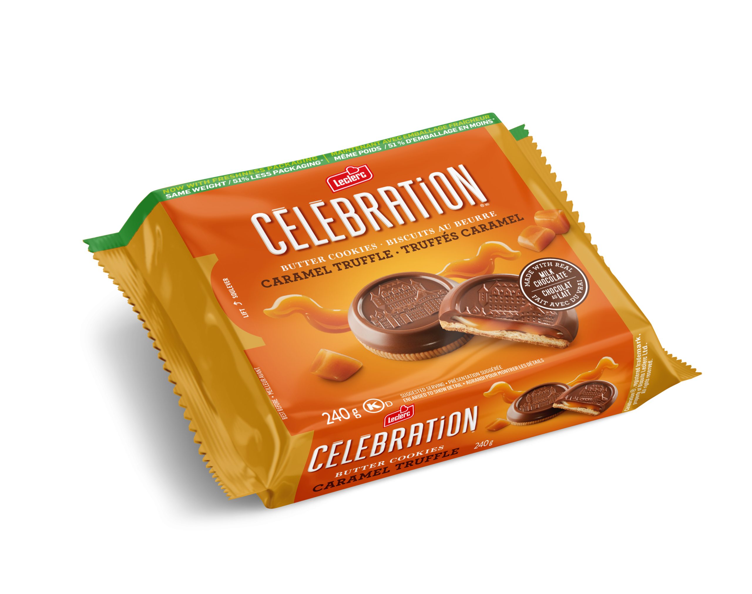 Chocolat au lait (sucre, beurre de cacao, liqueur de chocolat, substances laitières, lécithine de soya, vanilline), Farine de blé enrichie, Garniture au caramel (glucose, cassonade, sucre, huile de noix de coco et/ou de soya hydrogénée, eau, substances laitières modifiées, sel, arôme artificiel, lécithine de soya), Sucre, Beurre (lait), Sel, Bicarbonate de sodium, Lécithine de soya, Arôme artificiel.