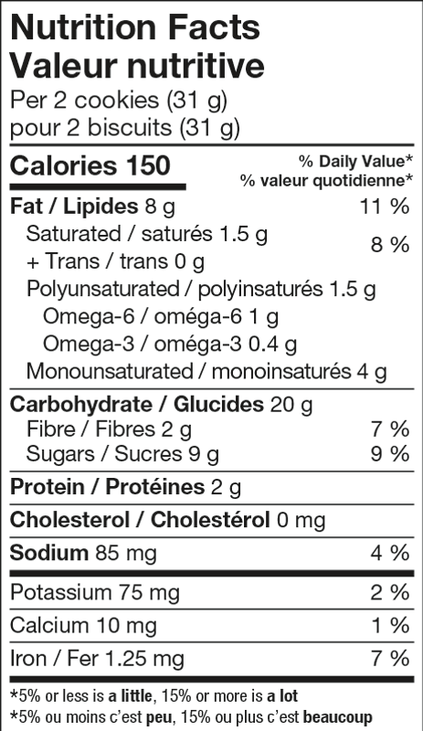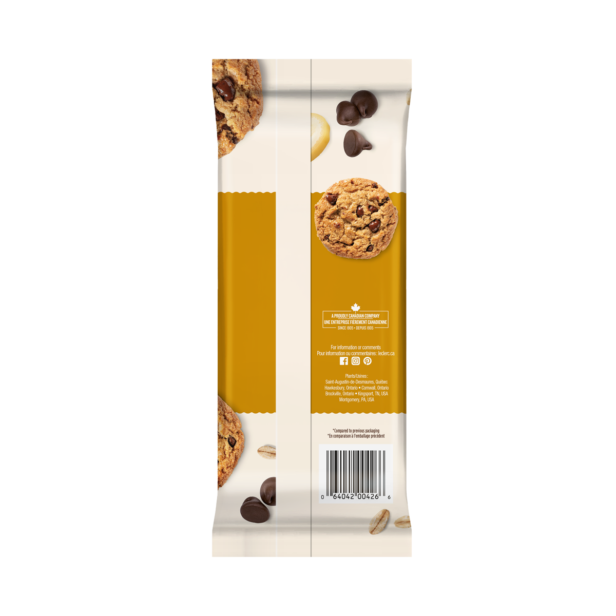 Farine de blé enrichie, Sucres (cassonade, sucre, bananes déshydratées), Brisures de chocolat noir (liqueur de chocolat, sucre, dextrose, beurre de cacao, lécithine de soya, extrait de vanille), Huile de canola, Son d'avoine, Flocons d'avoine entière, Fibres de balles d'avoine, Oeuf entier liquide, Bicarbonate de sodium, Arôme naturel, Sel, Lécithine de soya, Substances laitières modifiées.