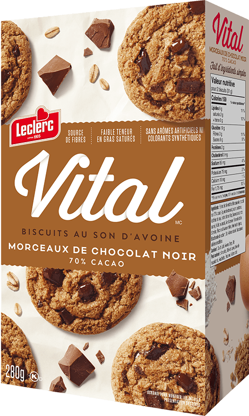Délicieux biscuits au son d’avoine et morceaux de chocolat noir 70 % cacao. Ils sont une source de fibres. Sans arômes ni colorants artificiels, on les aime parce qu’ils goûtent le vrai!