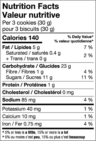 Farine de blé enrichie, Sucres (sucre, mélasse qualité fantaisie), Huile de canola, Gingembre, Bicarbonate de sodium, Oeuf entier liquide, Sel, Lécithine de soya, Substances laitières modifiées. Contient : Oeufs, Lait, Soya, Blé.