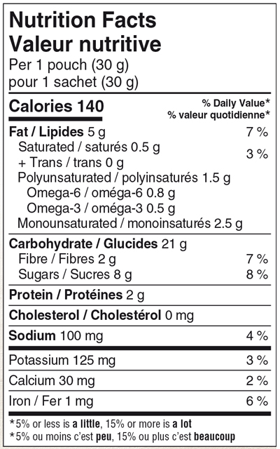 Mélange d'avoine (flocons d'avoine entière, farine d'avoine entière), Sucres (cassonade, mélasse pour cuisson), Farine de blé enrichie, Huile de canola, Graines de chia moulues, Fibres de balles d'avoine, Bicarbonate de sodium, Gingembre, Sel, Épices, Lécithine de soya, Substances laitières modifiées. Contient : Lait, Avoine, Soya, Blé.