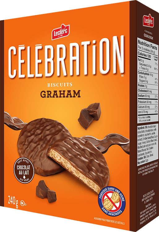 Chocolat au lait (sucre, beurre de cacao, liqueur de chocolat, substances laitières, lécithine de soya, extrait de vanille), Farine de blé enrichie, Sucres (sucre, miel), Farine graham (blé), Huiles de palme et de palmiste modifiées, Arôme naturel, Sel, Bicarbonate de sodium, Lécithine de soya.