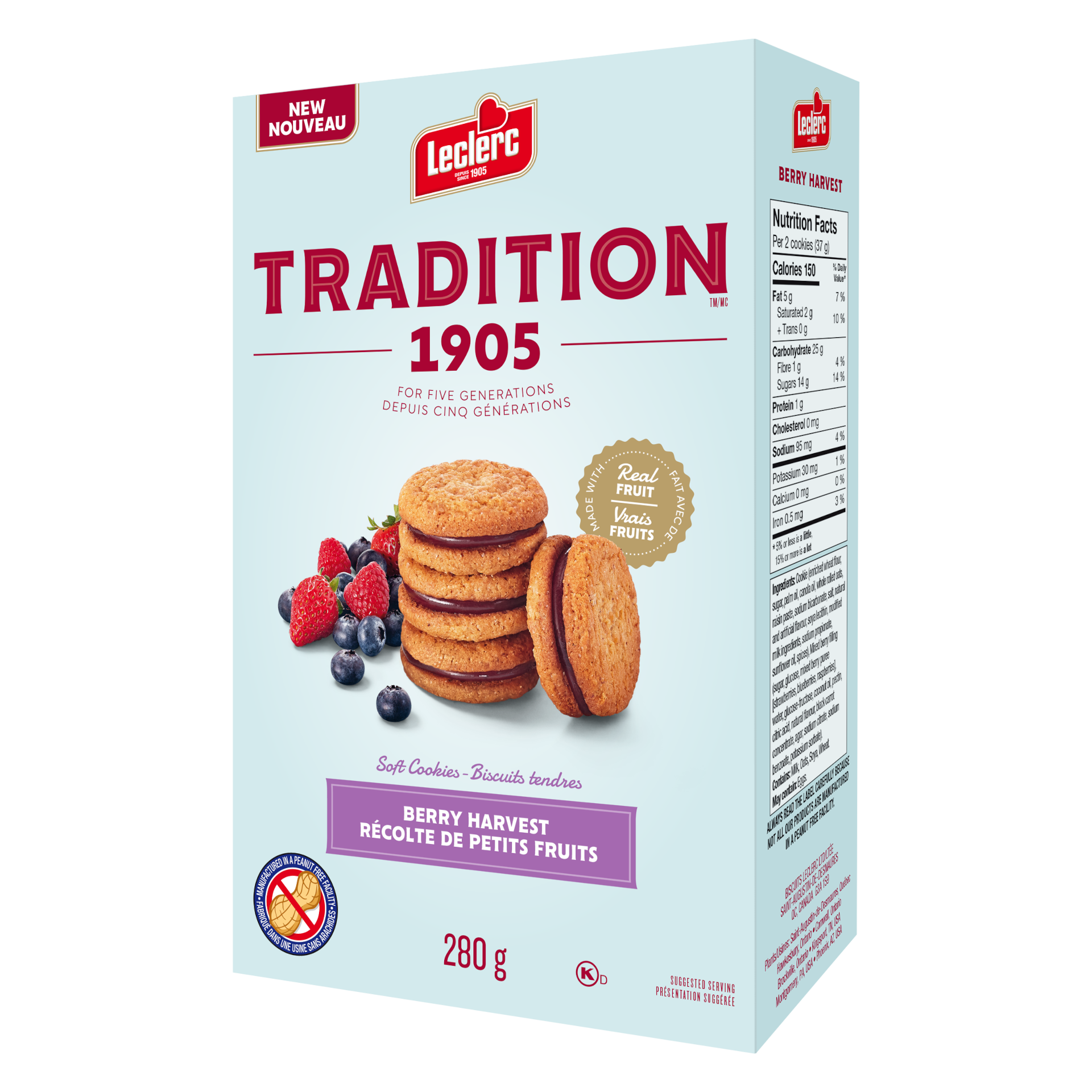 Biscuit (farine de blé enrichie, sucre, huile de palme, huile de canola, flocons d'avoine entière, pâte de raisins secs [raisins secs, huile de tournesol], bicarbonate de sodium, sel, arôme naturel et artificiel, lécithine de soya, substances laitières modifiées, propionate de sodium, épices), Garniture aux fruits des champs (sucre, glucose, purée de fruits des champs [fraises, bleuets, framboises], eau, glucose-fructose, huile de noix de coco, pectine, acide citrique, arôme naturel, concentré de carotte noire [concentré de carotte noire, acide citrique], agar-agar, citrate de sodium, benzoate de sodium, sorbate de potassium).