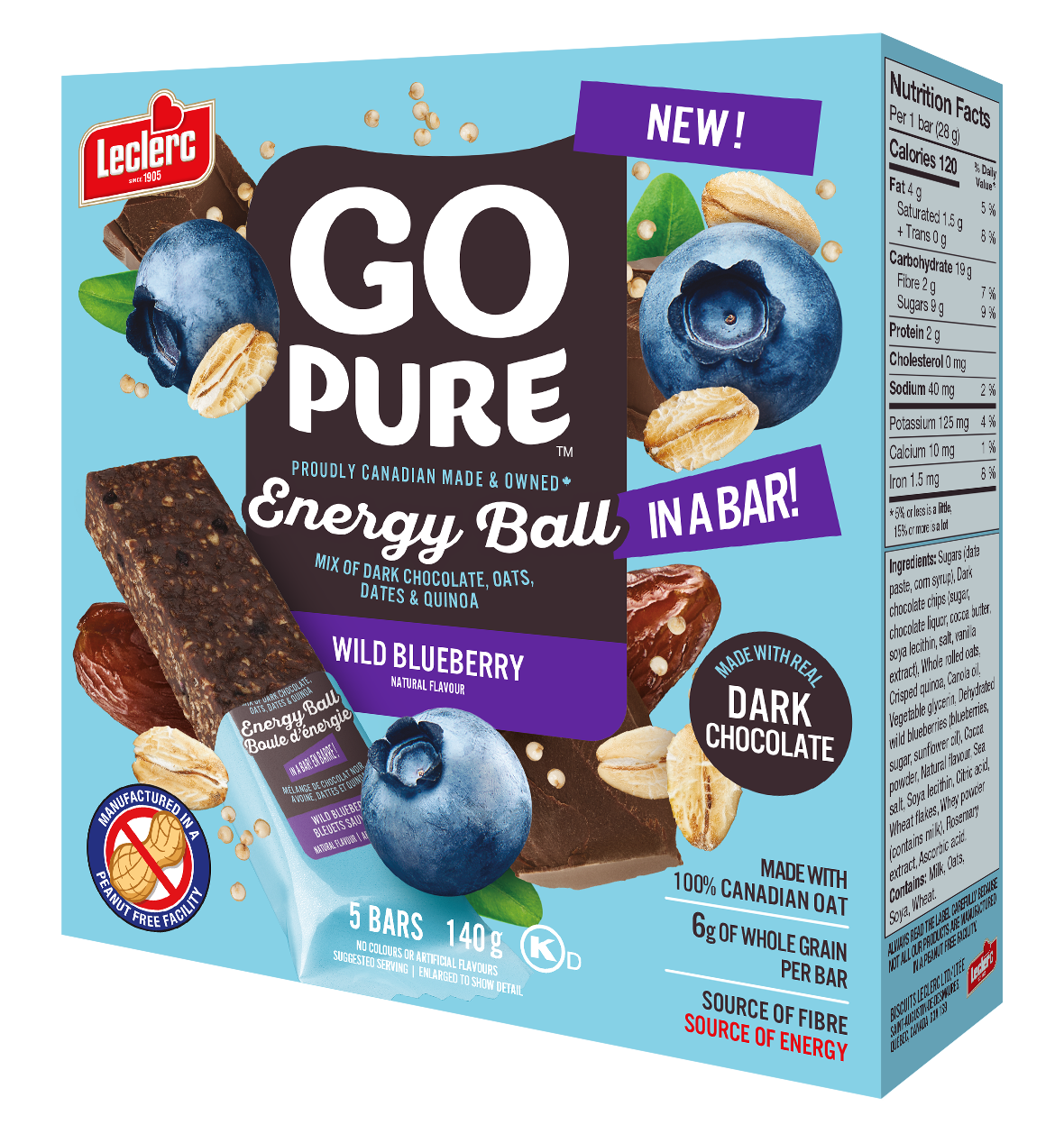 Sucres (pâte de dattes, sirop de maïs), Brisures de chocolat noir (sucre, liqueur de chocolat, beurre de cacao, lécithine de soya, sel, extrait de vanille), Flocons d'avoine entière, Quinoa croustillant, Huile de canola, Glycérine végétale, Bleuets sauvages déshydratés (bleuets, sucre, huile de tournesol), Poudre de cacao, Arôme naturel, Sel de mer, Lécithine de soya, Acide citrique, Flocons de blé, Poudre de lactosérum (contient du lait), Extrait de romarin, Acide ascorbique.