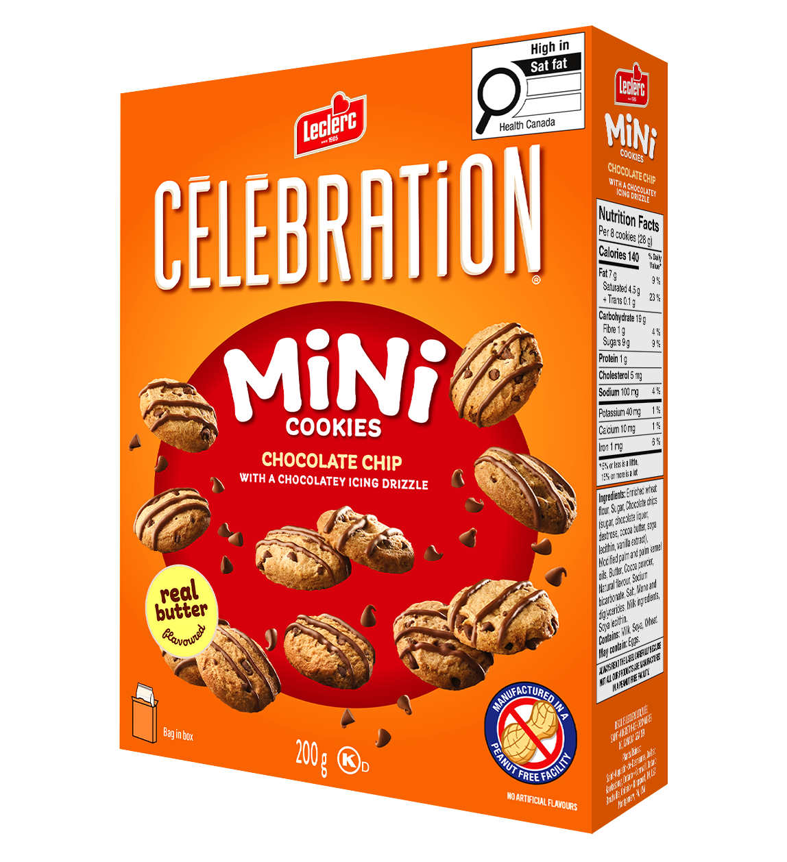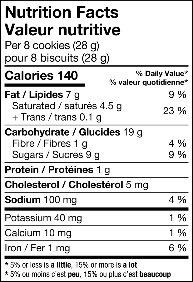 Farine de blé enrichie • Sucre • Brisures de chocolat (sucre, liqueur de chocolat, dextrose, beurre de cacao, lécithine de soya, extrait de vanille) • Huiles de palme et de palmiste modifiées • Beurre • Poudre de cacao • Arôme naturel • Bicarbonate de sodium • Sel • Mono et diglycérides • Substances laitières • Lécithine de soya