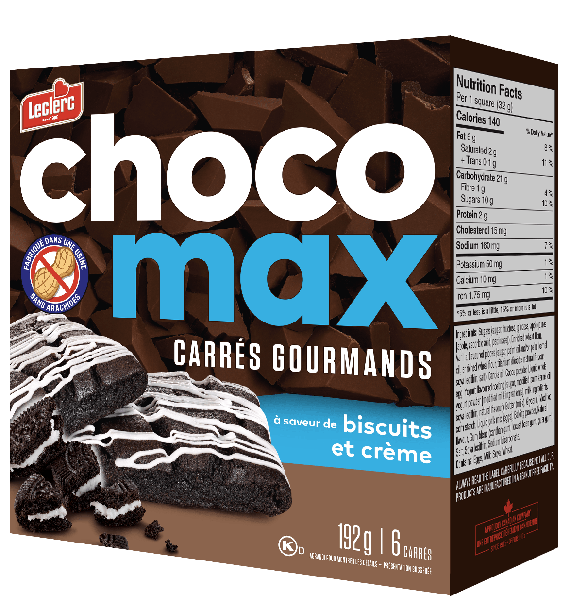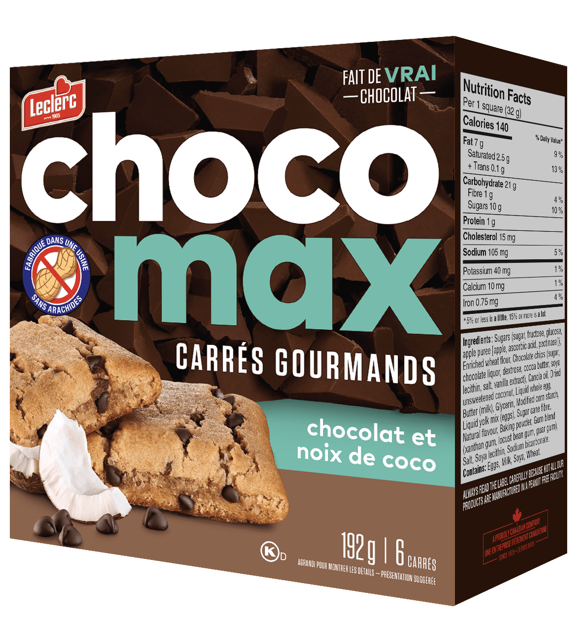 Sucres (sucre, fructose, glucose, purée de pomme [pommes, acide ascorbique, pectinase]), Farine de blé enrichie, Brisures de chocolat blanc (sucre, beurre de cacao, substances laitières modifiées, lécithine de soya, extrait de vanille), Huile de canola, Poudre de cacao, Oeuf entier liquide, Beurre (lait), Glycérine, Amidon de maïs modifié, Mélange liquide de jaunes d'oeufs, Poudre à pâte, Arôme naturel, Mélange de gommes (gomme de xanthane, gomme de caroube, gomme de guar), Sel, Lécithine de soya, Bicarbonate de sodium.