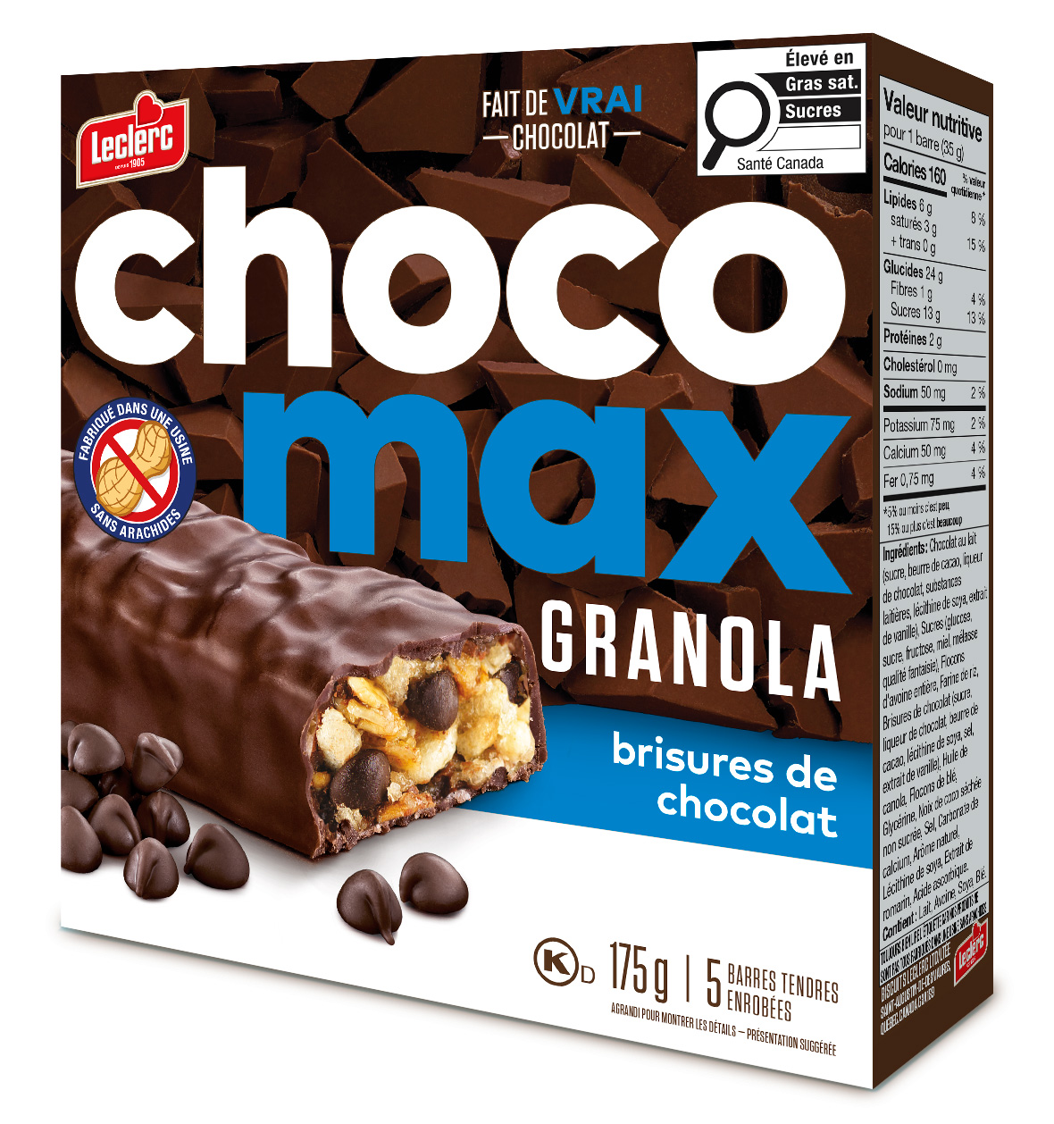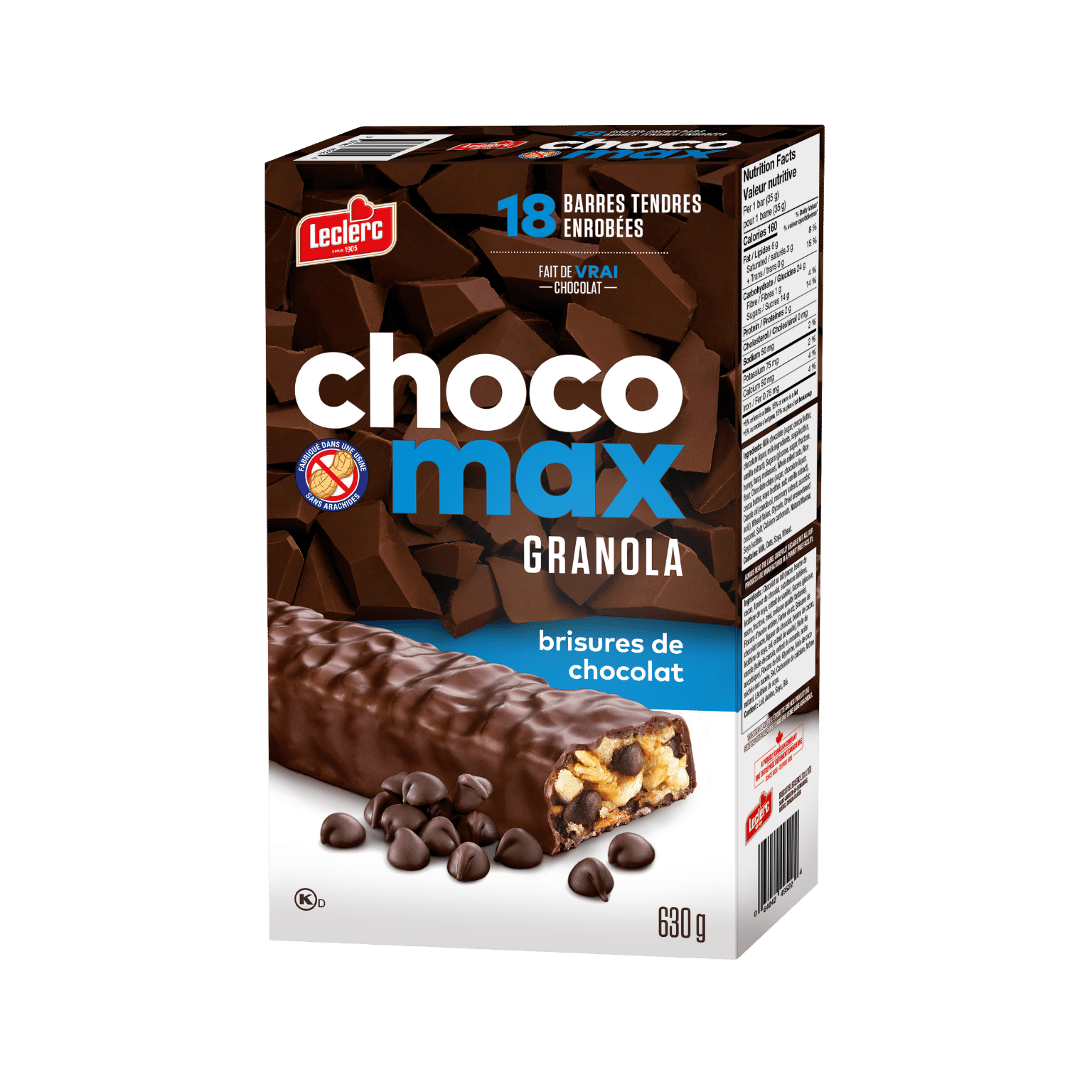 Chocolat au lait (sucre, beurre de cacao, liqueur de chocolat, substances laitières, lécithine de soya, extrait de vanille), Sucres (glucose, sucre, fructose, miel, mélasse qualité fantaisie), Flocons d'avoine entière, Farine de riz, Brisures de chocolat (sucre, liqueur de chocolat, beurre de cacao, lécithine de soya, sel, extrait de vanille), Huile de canola (huile de canola, extrait de romarin, acide