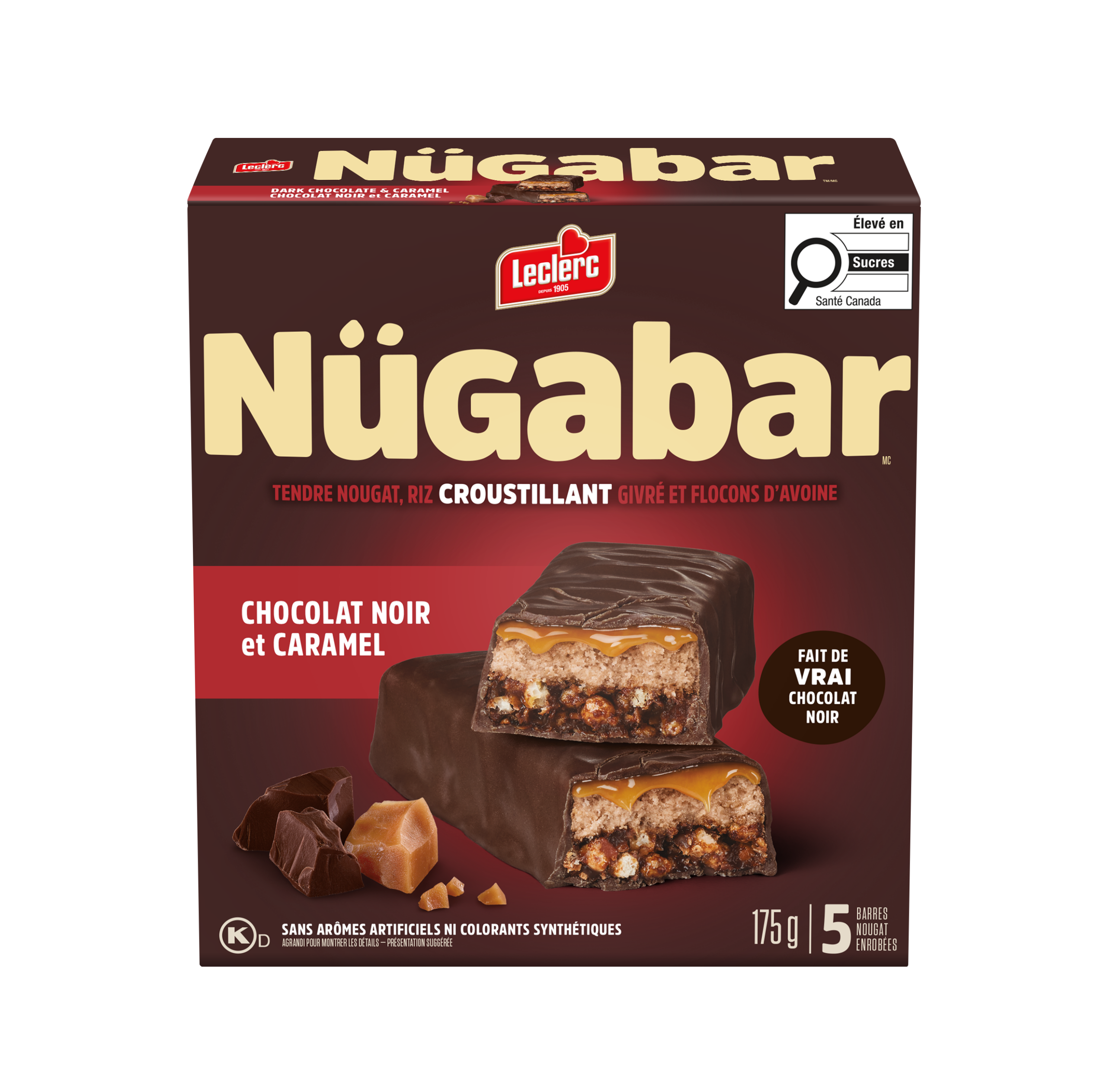Sucres (glucose, sucre, sucre à glacer, fructose, miel, extrait sec de malt [orge]), Chocolat au lait (sucre, beurre de cacao, liqueur de chocolat, substances laitières, lécithine de soya, extrait de vanille), Riz croustillant givré (farine de riz, sucre, huile de canola, carbonate de calcium, sel, mélasse qualité fantaisie, bicarbonate de sodium, lécithine de soya), Huile de canola, Flocons d'avoine entière, Morceaux de biscuits au chocolat (farine de blé enrichie, sucre, poudre de cacao, huile de palme, glucose, bicarbonate de sodium, sel, arôme naturel, substances laitières), Substances laitières modifiées, Glycérine, Poudre de cacao, Amidon de blé, Sel, Arôme naturel, Lécithine de soya, Beurre d'amande, Beurre d'arachide, Beurre de noix de cajou, Extrait de romarin, Acide ascorbique, Carotène, Huile de tournesol.