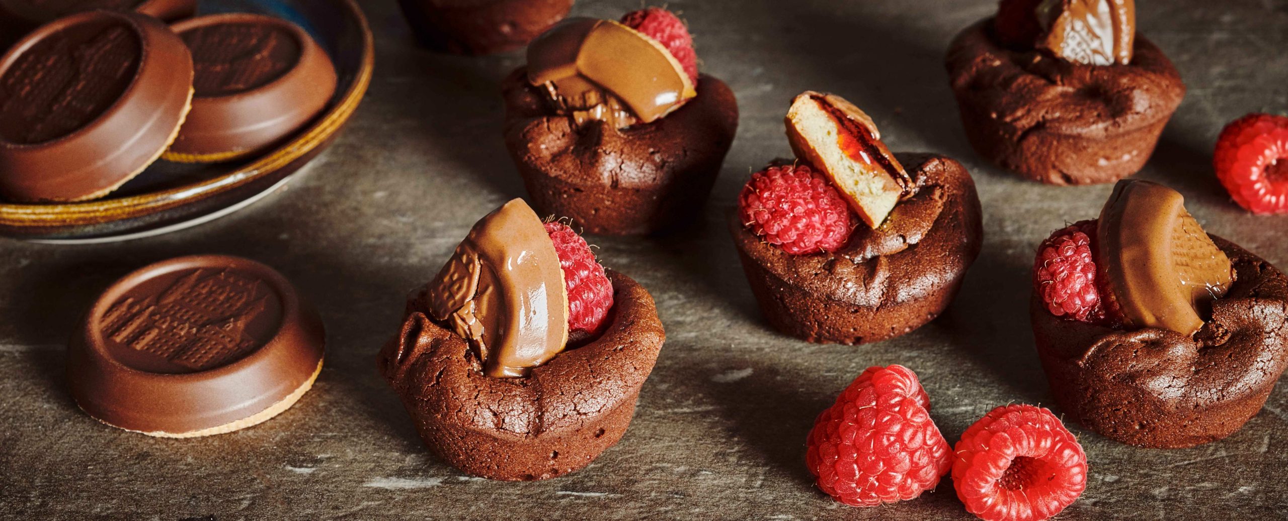- Déposer un quartier de biscuit dans chaque moule. Répartir la pâte dans les moules (voir note). Déposer une framboise et insérer la pointe d’un quartier de biscuits sur chaque brownie.